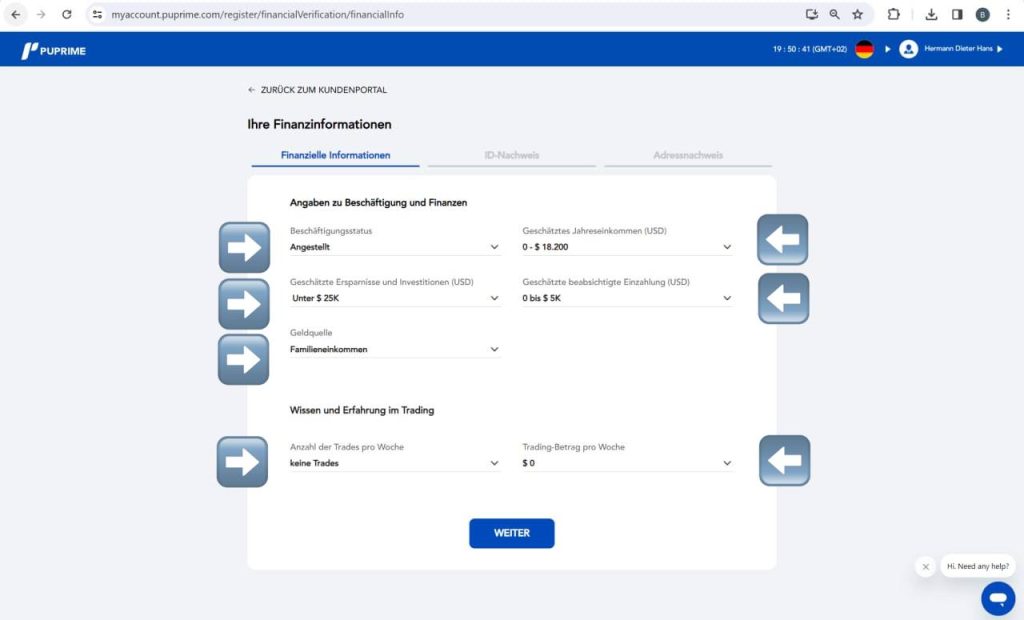 Dafür müsst ihr folgende Daten in den mit Pfeilen markierten Kästchen auswählen und die Option wählen die eurer Situation am nächsten kommt. (Prinzipiell ist es völlig egal was ihr eingebt, ihr könnt also auch direkt auf den „WEITER“ Button)